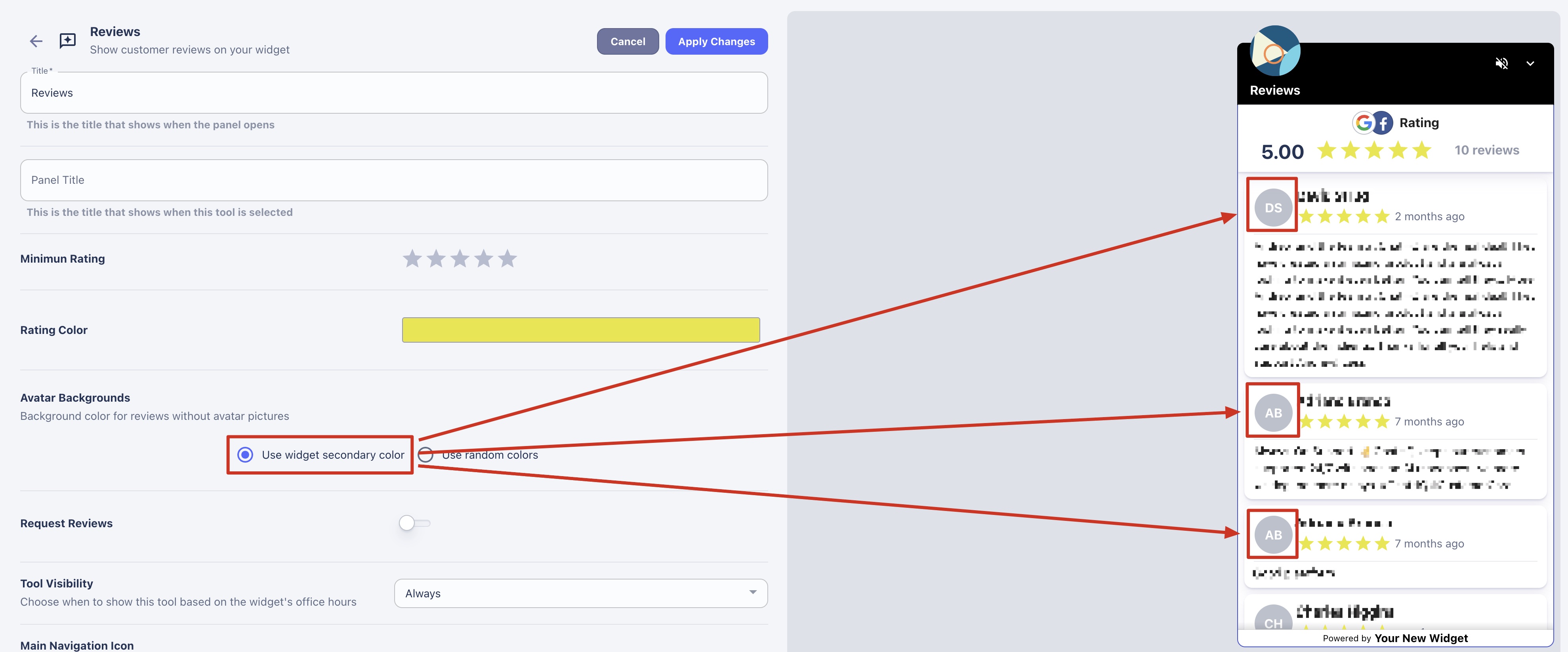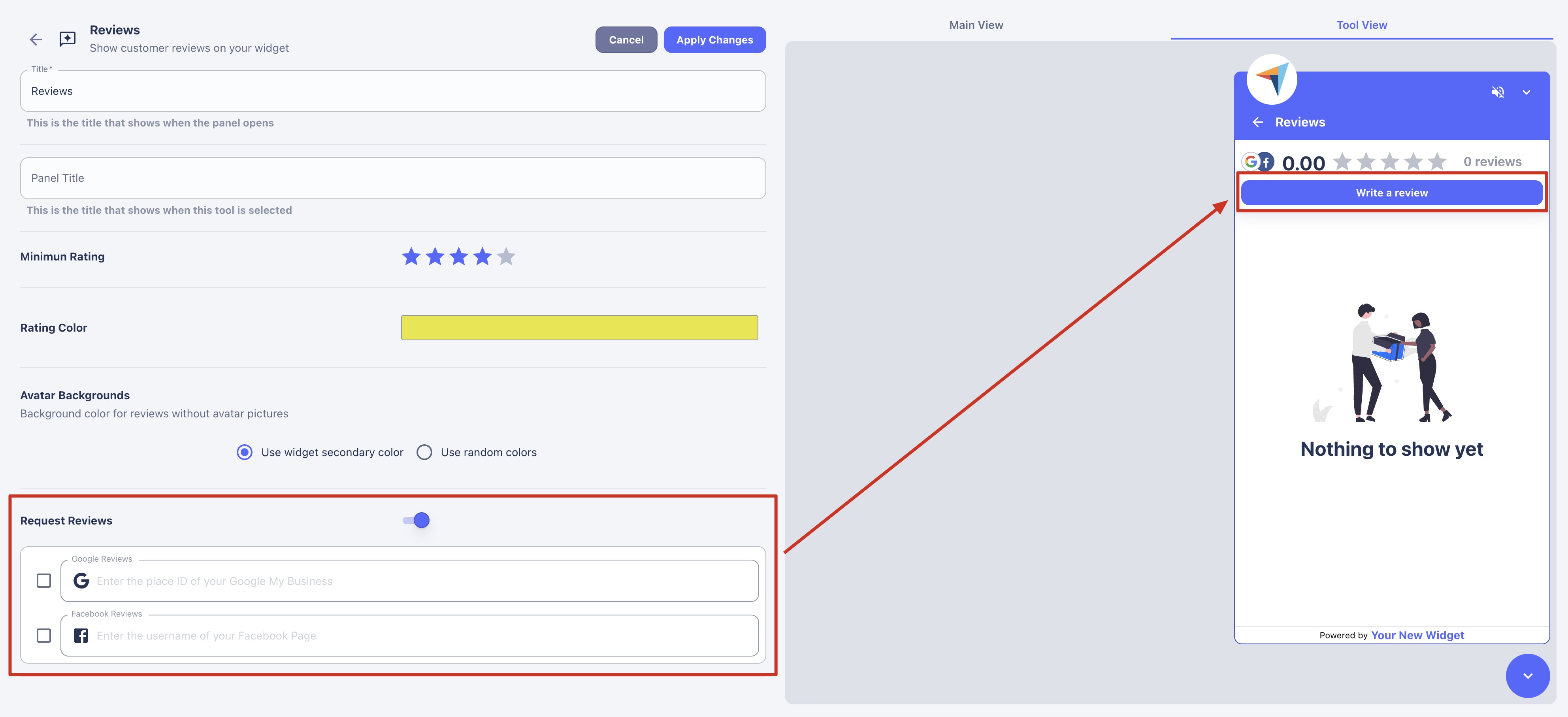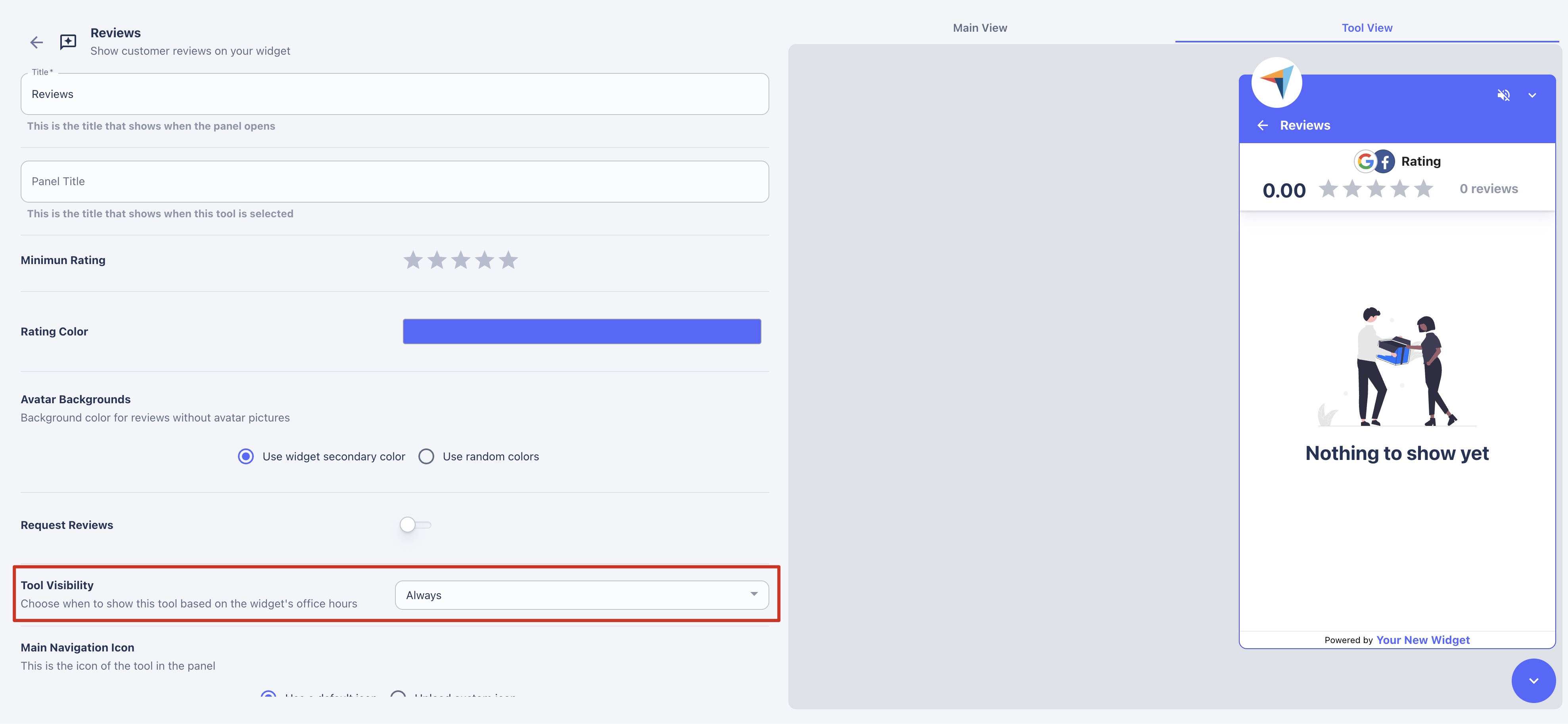 * **Title:** Set the name of the Reviews tool that will be displayed on the initial widget view.