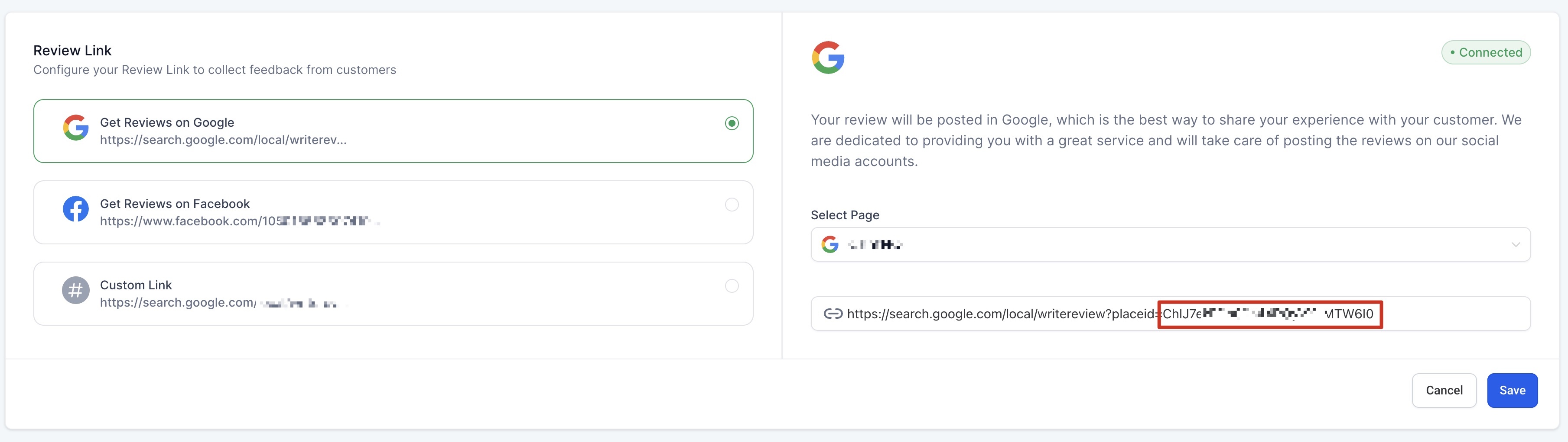 To find your Google Places ID, log into your CRM, go to **Settings**, and click on **Reputation Management.** If you have not yet generated a review link, click on the **Generate Link** button. Once you have generated a review link, you will see your Google Places ID at the end of the link, as shown below.