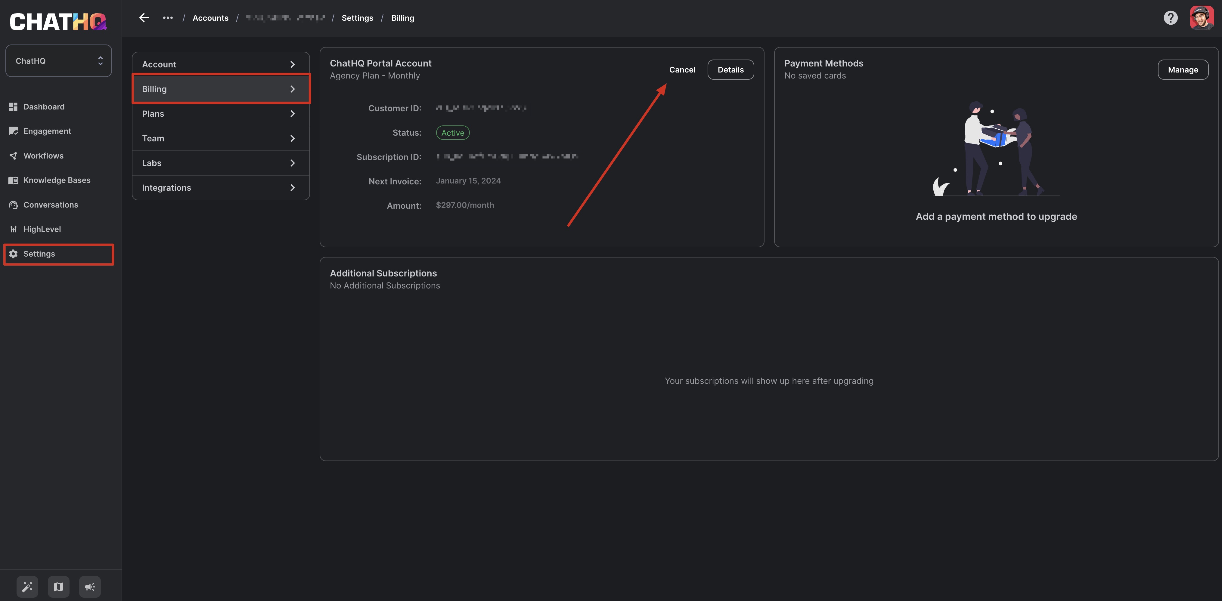 If you're looking to update or add new payment methods, change your billing information, or update your subscription plan in ChatHQ, follow the steps below.